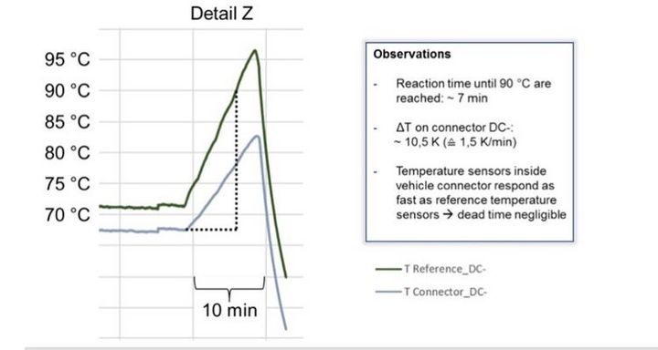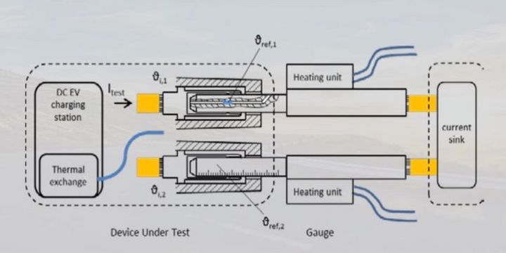 上圖是IEC提出的用以丈量充電插頭的測驗設備。我們知道,因為我國的直流連接器的公母和歐美日標準是相反的(原因有夠寫一篇傳奇史的了,今日就不多說了)。所以能夠大致能夠以為這個測驗設備能測驗我們的車輛插座。看一下圖,要害有兩點,第一是直埋的溫度傳感器,留意因為這是試驗電路,僅僅用于通過模仿大電流丈量溫度反響,一般電壓只需3,4V所以此刻作為丈量的溫度傳感器是能夠緊緊貼在銅導體上,因而測到實在溫度是精確的。第二是那個HEATINGUNIT,就是一個加熱塊,是用于模仿連接器毛病的。大致試驗進程如下,用額定電流,比方400A,通過一段時刻后進入熱安穩,調整加熱塊模仿事端溫度損壞熱平衡。當實在溫度到達90度時,監測丈量溫度是否給出了正確的特性,或許假如是丈量體系則看體系是否有正確的反響,比方堵截了充電電流。