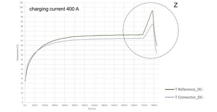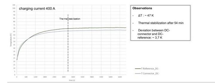 看一下上圖,這是一張德國人做的做的某連接器的溫度丈量曲線(順便說一句,文頂用的圖,都是從揭露材料或通過本人贊同答應運用的圖,不算盜版哈)。這張圖中,TReference是指的觸摸面實踐的溫度,下稱實踐溫度,TConnector是指的連接器上溫度傳感器給出的溫度,下稱丈量溫度。能夠看出來,當通過400A電流后,進過大約54分鐘,溫度進入了安穩區,大約為70度出面,此刻那個設備有一點間隔的連接器給出的溫度是大約67度左右,和實在溫度大約一直有3.7度左右的距離。